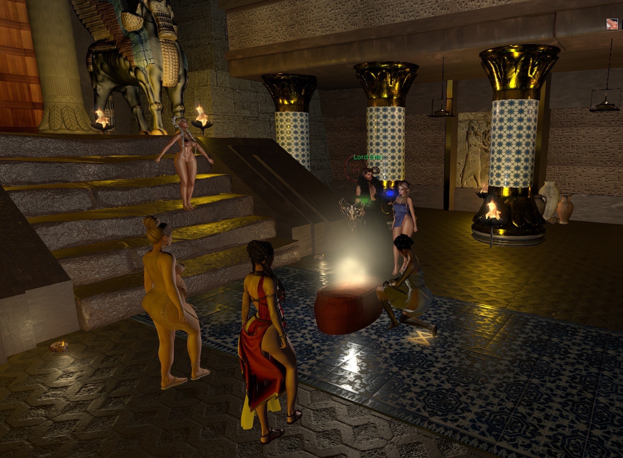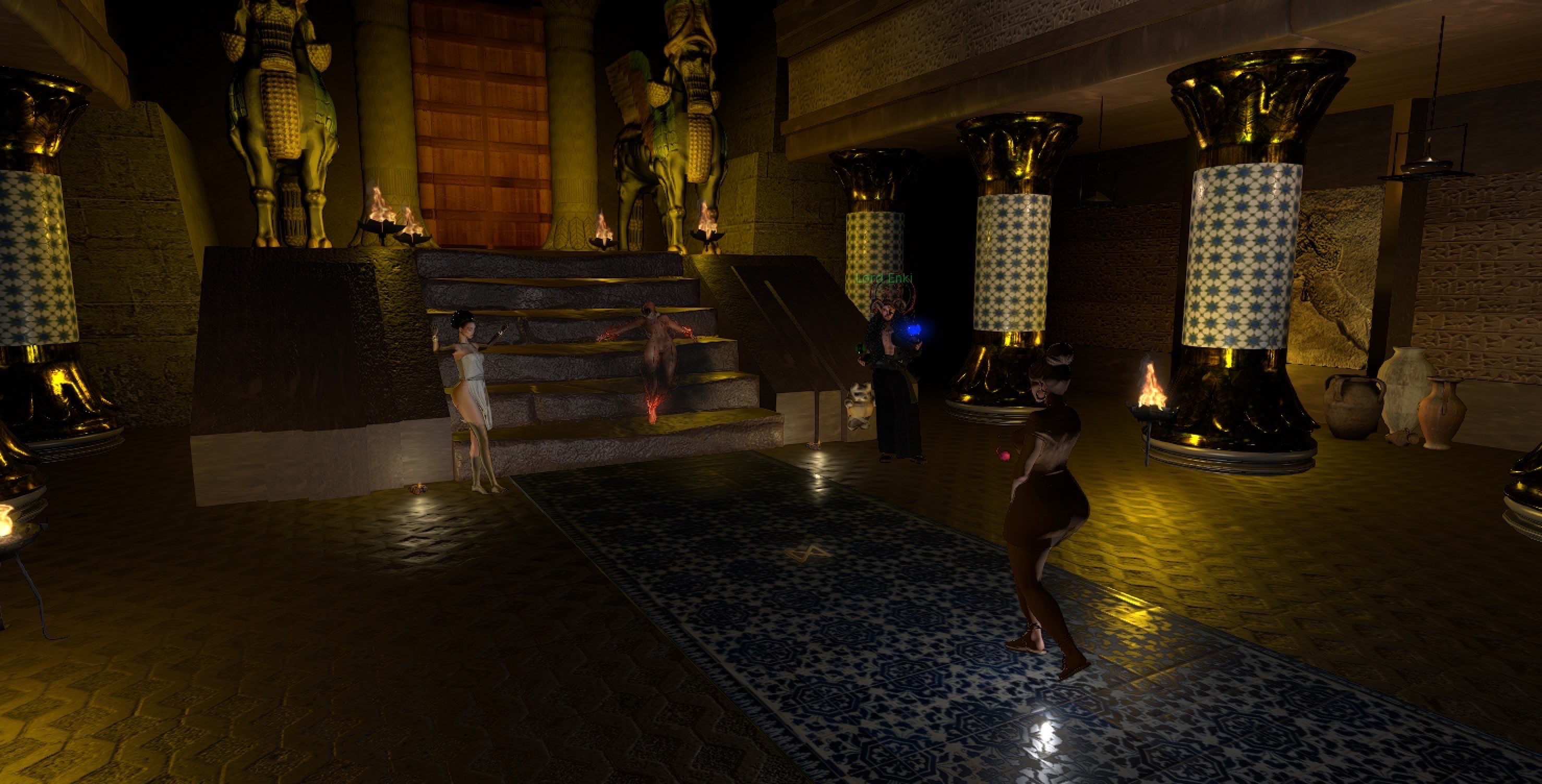 Well, the demons of my world have their own scriptures, with Inanna as the hero, and themselves as much more active participants (as seen in the Inimgi Dua epigraphs). And because I have awesome friends, they created a ritual re-enactment of Inanna’s ascent from the underworld, each of them giving a different gift. She starts out naked and on fire, and ends fully robed and empowered.